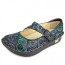 The Alegria Alli Collection is part of the Professional line from Alegria Shoes. This means it offers the additional feature of a stain resistant leather upper plus the slip resistant outsole--perfect for the professional who wants style, comfort, and functionality. To add adjustability across the instep the Alli Black Silver Rose has gunmetal colored decorative double buckles that conveniently hide velcro closures. The Alli Black Silver Rose is gorgeous with a textured embossed leather upper that is polished to a high shine. The silver highlights on the floral design also offer a slight irredescence when the light hits the leather and compliment the silver stitching. Like most Alegria shoes, this loafer has a generous toe box so that your toes can spread out, reducing metatarsal pressure and reducing overall foot fatigue. The unparalleled comfort comes from many unique features such as: