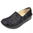 The Alegria Alli Collection is part of the Professional line from Alegria Shoes. This means it offers the additional feature of a stain resistant leather upper plus the slip resistant outsole--perfect for the professional who wants style, comfort, and functionality. To add adjustability across the instep the Alli Black Silver Rose has gunmetal colored decorative double buckles that conveniently hide velcro closures. The Alli Black Silver Rose is gorgeous with a textured embossed leather upper that is polished to a high shine. The silver highlights on the floral design also offer a slight irredescence when the light hits the leather and compliment the silver stitching. Like most Alegria shoes, this loafer has a generous toe box so that your toes can spread out, reducing metatarsal pressure and reducing overall foot fatigue. The unparalleled comfort comes from many unique features such as: